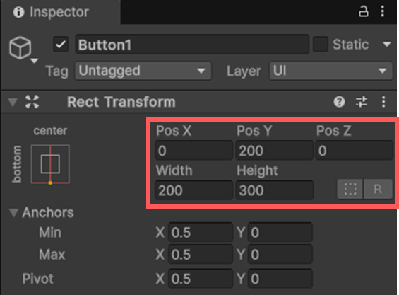 Button1オブジェクトのInspectorビューを表示し、Transformで四角形で描かれているAnchor Presetの設定をShiftキーを押しながらBottom-Centerに変更します。