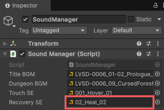 HierarchyビューにあるSoundManagerオブジェクトをクリックして、Inspetorビューを表示します。