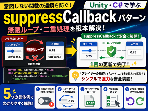UnityでUIを開発したり、スクリプトでUIを操作していると「コードで値を変えたら意図しない関数が連鎖して無限ループしてしまう」という経験をしたことはないでしょうか。