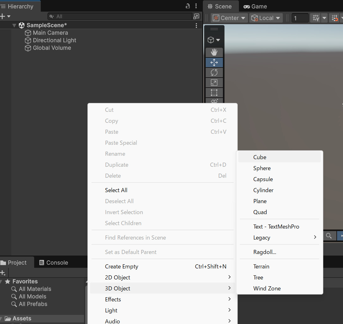 Hierarchyウィンドウの何もない場所で右クリックするとメニューが出ます。