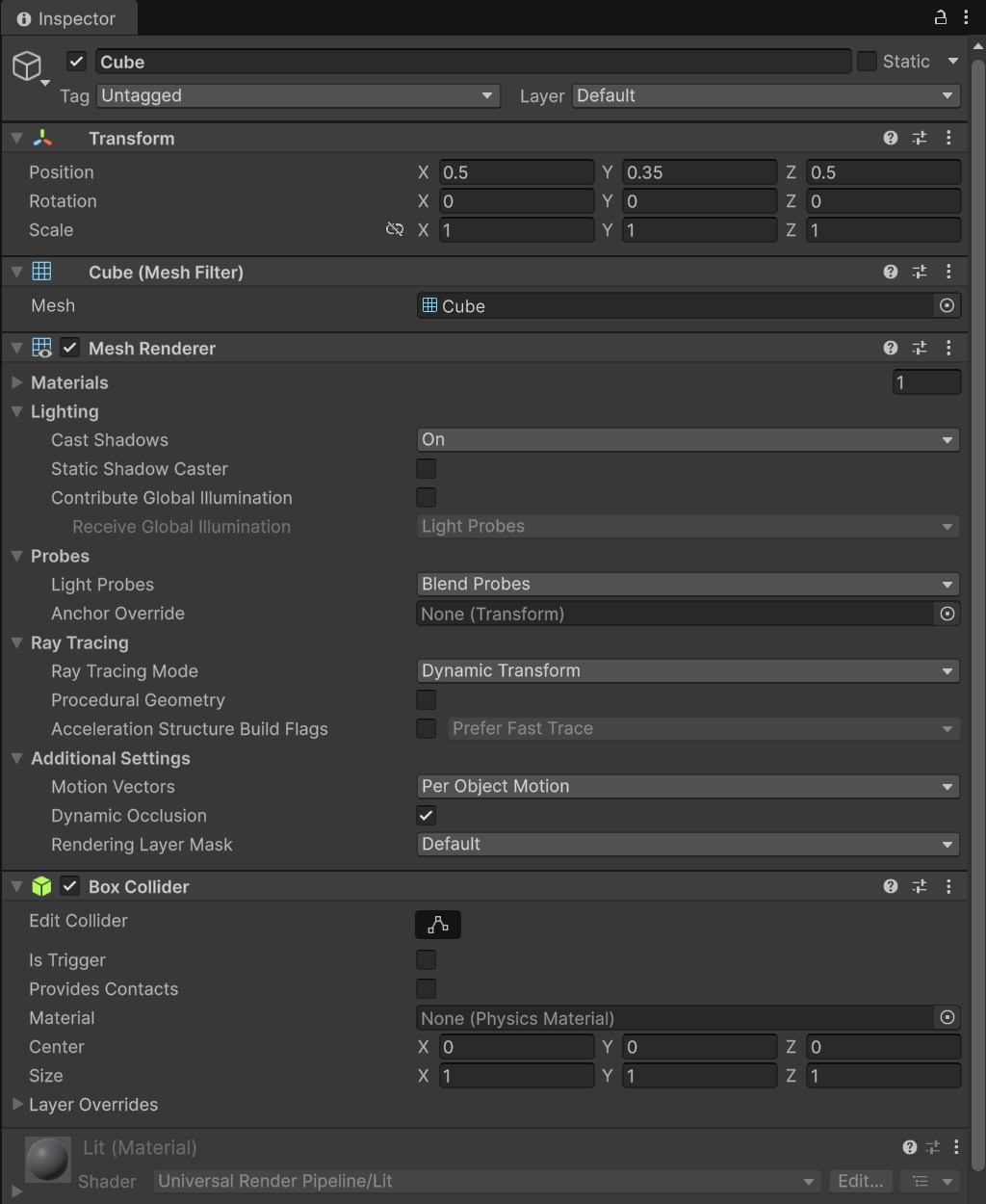 Inspectorの中に並んでいる「Transform」「Mesh Renderer」「Box Collider」などは、コンポーネント(Component)と呼ばれます。
