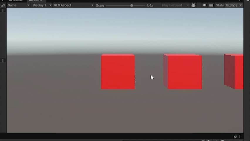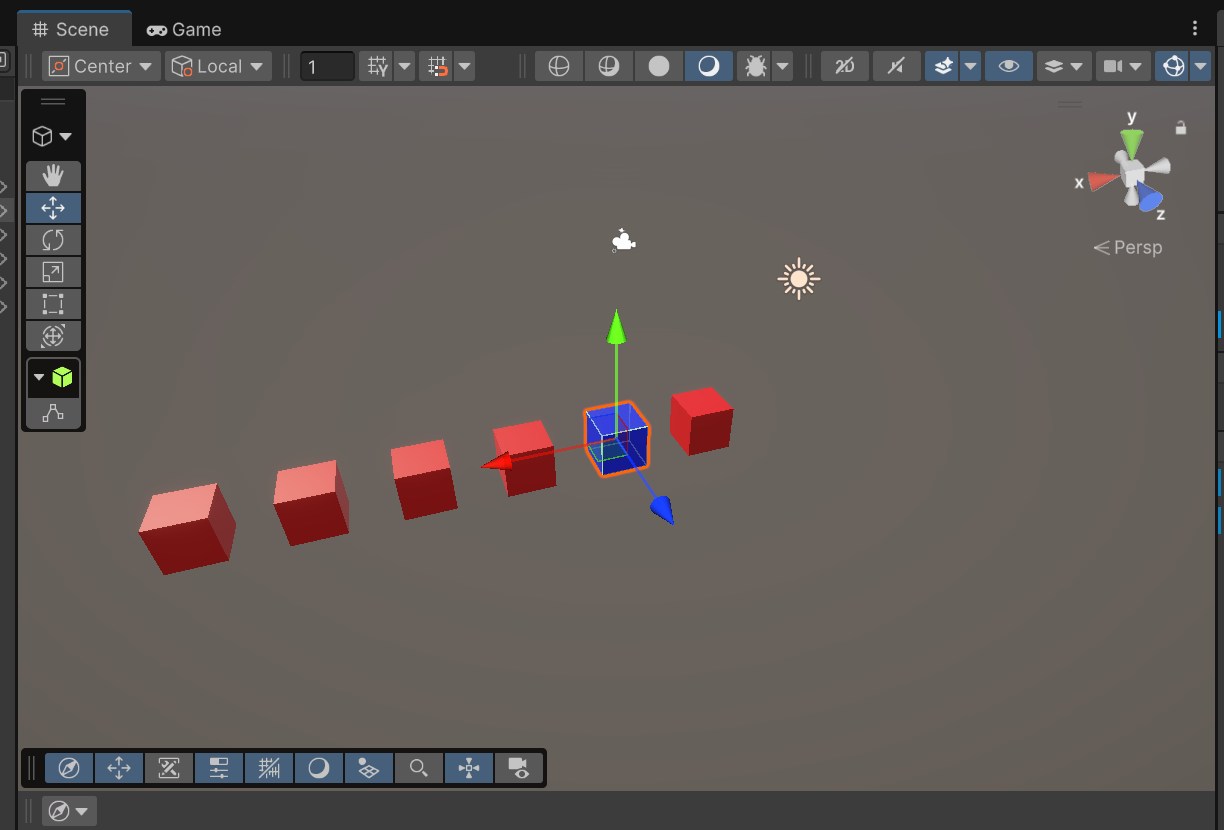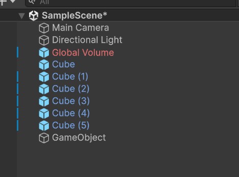 3. Sceneビューを見ると、さっき複製したすべてのCubeが赤くなっている!