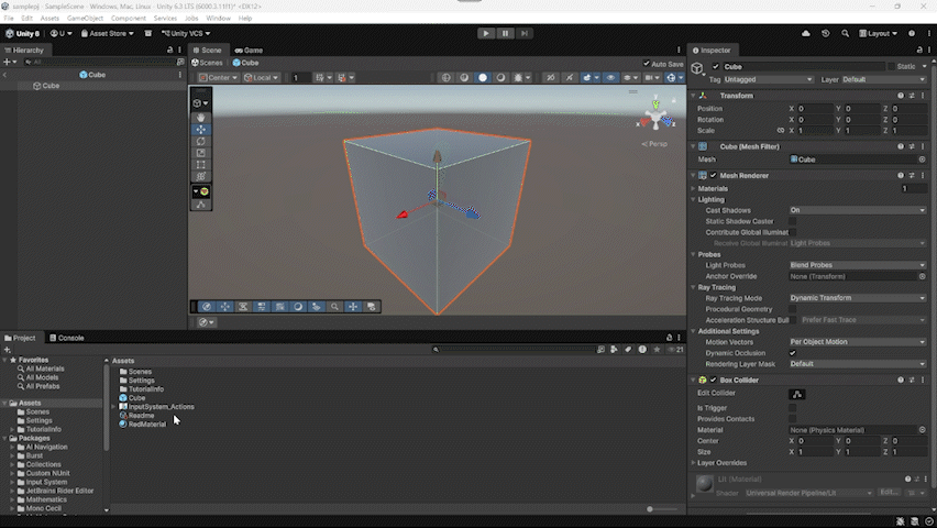 3. ProjectウィンドウのRedMaterialを、SceneビューのCubeへドラッグ&ドロップする