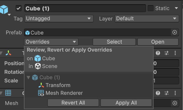 • Apply All:個別の変更をプレハブ本体にも反映する(全インスタンスに広がる)