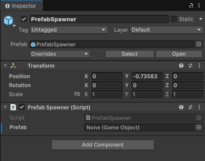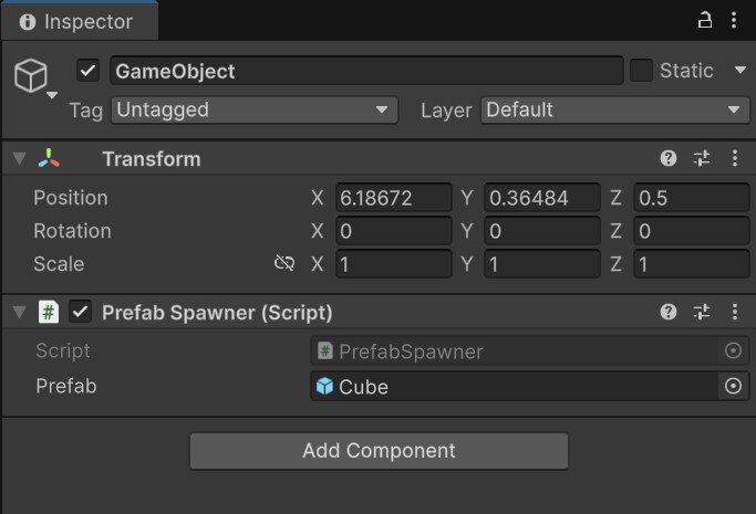 2. InspectorのPrefab Spawner (Script)の中に「Prefab」という欄がある(「None (Game Object)」と表示されている)