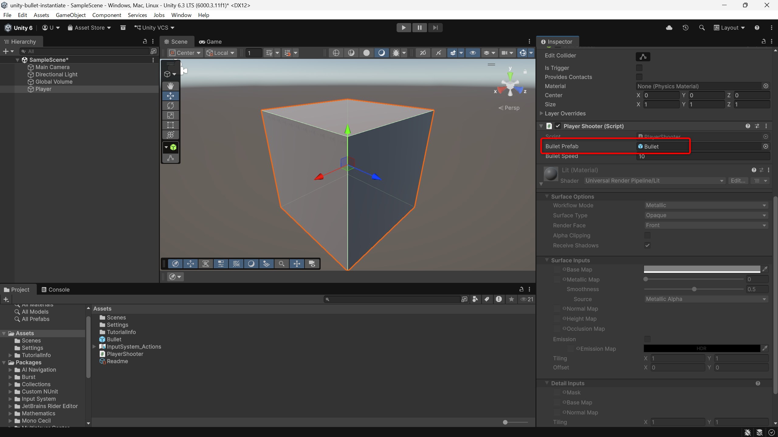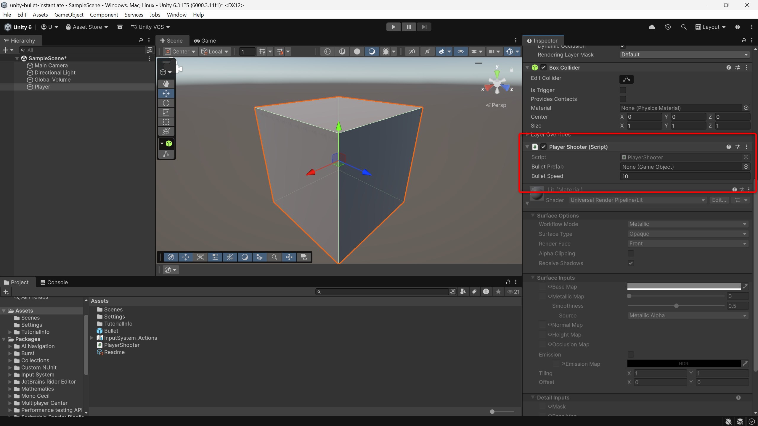 - InspectorのPlayer Shooter (Script)の中に「Bullet Prefab」という欄がある(「None (Game Object)」と表示されている)