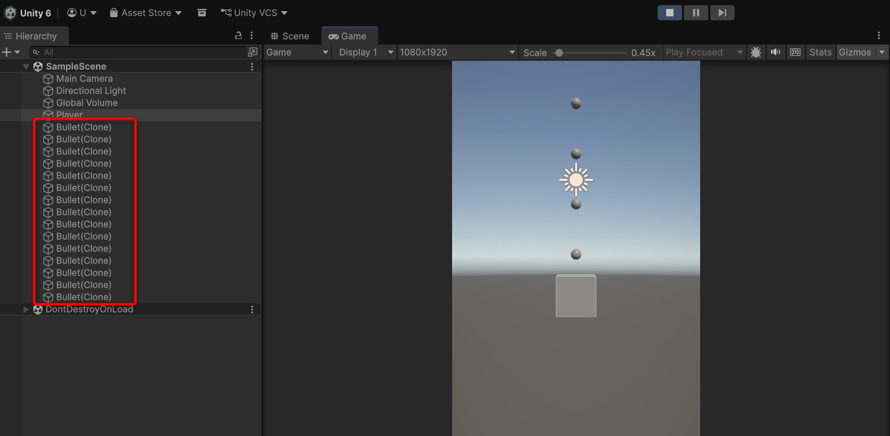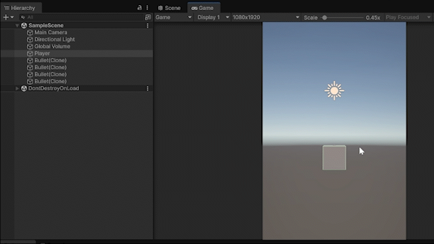 - Hierarchyを見ると「Bullet(Clone)」が生成され、3秒後に消えることを確認